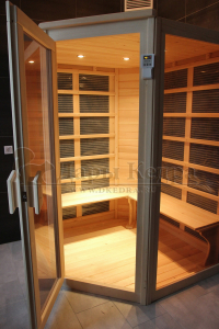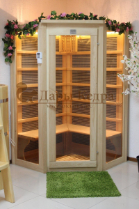 Это специально оборудованная кедровая кабина для прогрева тела человека сухим теплом. Воздух в таких парных не нагревается. Инфракрасные лучи воздействуют на тело, равномерно прогревая мышцы, суставы и органы. Карбоновые излучатели, встроенные в стены кабины, обладают мягким прогревом, что полностью исключает возможность ожога. Работает кабина за счет электричества. Установка сауны в угол, позволяет рационально использовать пространство помещения. Подходит как для домашнего использования, так и для коммерции.