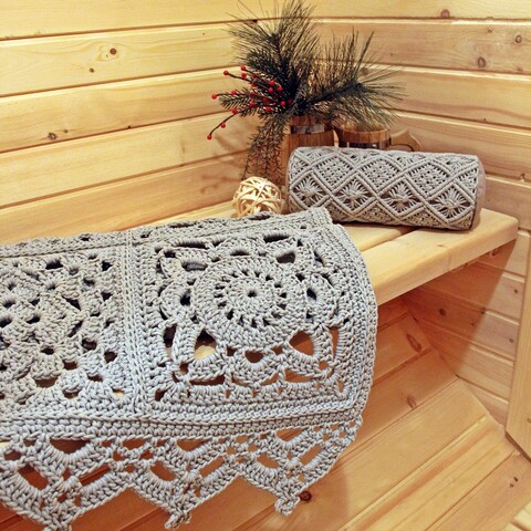 • Ковер и подушка «Жить здорово!» Ковер и подушка ручной работы сделают комнату отдыха в бане, квартире или доме уютной, теплой и современной. Ковер идеально ровно ложится на полу или полке в бане. Его не придется выправлять, выравнивать, профессиональная вязка мастерицы не оставит равнодушным даже самого взыскательного покупателя. Комплект 'Жить здорово!' можно приобрести по частям. В этом случае стоимость каждой позиции уточняйте по телефону 8 800 500 49 65.