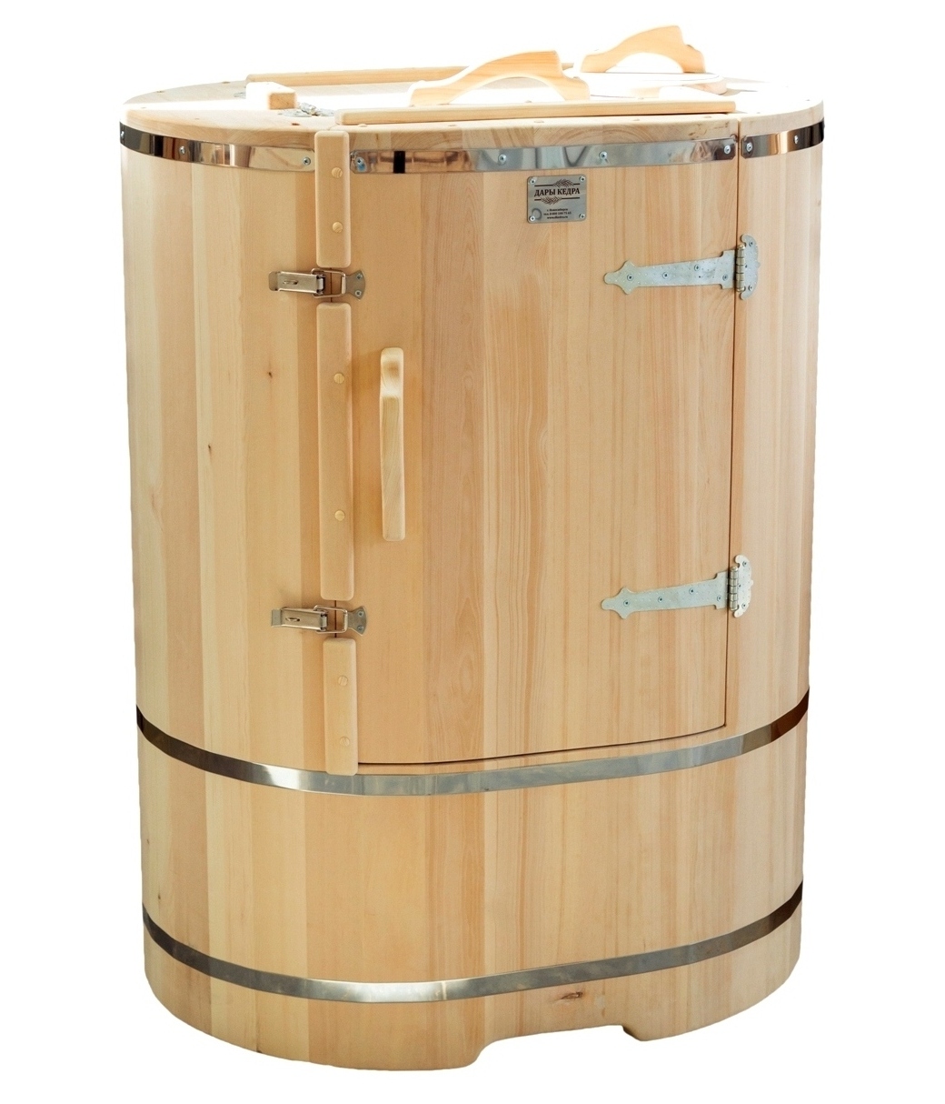 • Готовый комплект «Доступный»: кедровая бочка с парогенератором Готовый комплект - это полностью укомплектованный набор с фитобочкой для процедур парения. Круглая модель наиболее компактна и мобильна. Толщина стенок составляет 25 мм. Фитобочка оборудована откидными створками, дверцей и отверстием для головы. Во время парения человек сидит внутри кедровой бочки, а голова находится снаружи. Благодаря этому исключается возможность перегрева. Подлокотники из кедра, встроенные ручки на створках и двери делают эксплуатацию более удобной. Парение в фитобочке благотворно влияет на организм в целом: повышается иммунитет, выводятся шлаки и токсины, улучшается работа органов тела и состояние кожи.