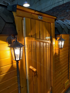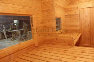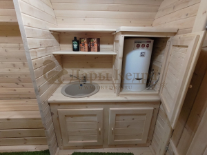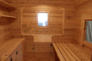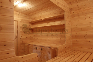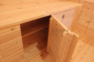 Домик с тремя помещениями подходит для дачного использования в теплое время года или обустройства загородных баз отдыха. Прихожая и кухня занимают одну комнату, в которой стоит стол из кедра. Две другие оборудованы четырьмя деревянными лежаками, по желанию их можно заменить на двуспальные кровати. Либо обустроить санузлом и душевой зоной. Для удобства пользования кемпинг дом можно укомплектовать верандой с лавочками или козырьком.