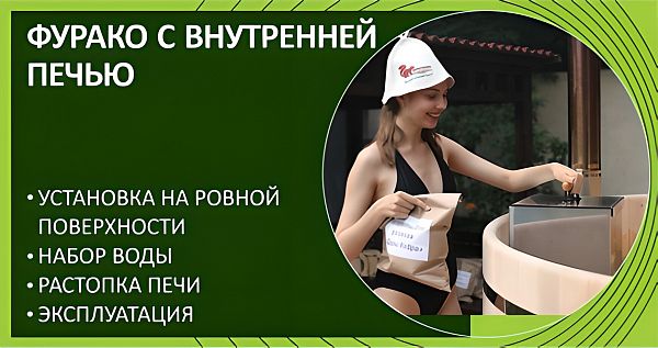 У стальной ёмкости расположение печи предполагается только под самой чашей, обеспечивая равномерный прогрев. Если нет возможности сразу купить конструкцию с печкой, то можно под чашей разводить костер, согревать воду таким, более дешевым путем. В уличной купели вариант размещения источника тепла может быть только снаружи или внутри. А значит, конструкция без печи работать полноценно не будет. - Обшивка сидений и подспинников банной чаши внутри выполняется из кедра или лиственницы. Купель изначально выполнена из дерева, поэтому все ее комплектующие в стандартной комплектации тоже деревянные. Внутри японской бани можно установить пластиковую вставку, тогда по аналогии с чаном сиденья будут обшиты деревом.