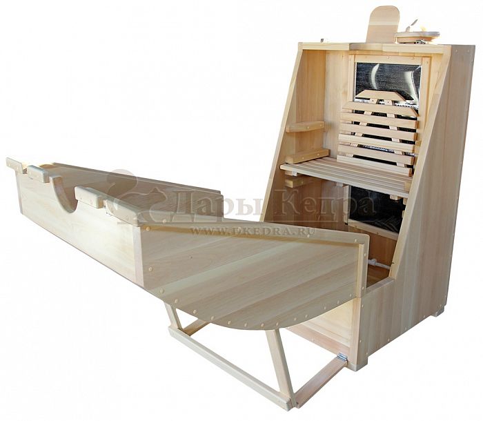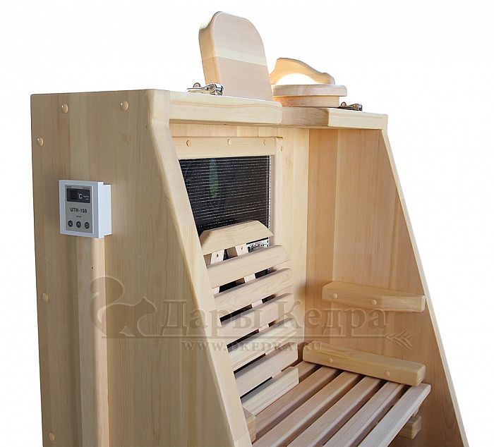 Удобное размещение человека внутри такой домашней мини-бани на регулируемой под его рост скамеечке с подлокотниками и подставкой для ног обеспечит комфортное пребывание и наслаждение проводимой процедурой. Дышать свежим воздухом, ароматизированным кедровой древесиной легко, приятно и очень полезно за счет фитонциодов, обеззараживающих воздух! Также рекомендуем в парогенератор поместить сбор трав «Фитопар» (заказать сборы также можно у нас на сайте) для усиления ароматерапии и оздоровительного эффекта на весь организм.